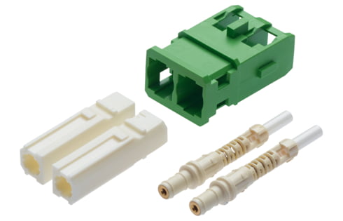 Locking type push-pull. Injection-molded PBT housing, UL 94 V-0 (flammability index). Ferrule with end-face of Ø 0.5 mm and 45° done angle.