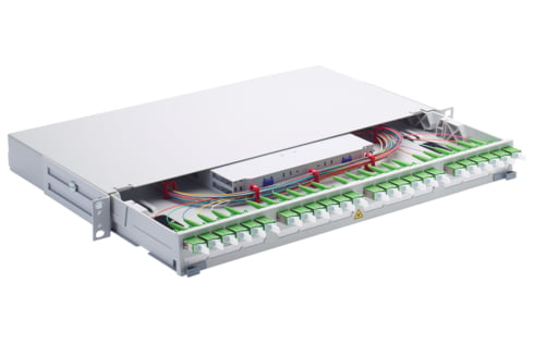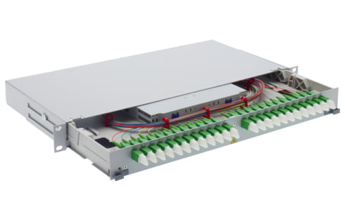 Scope of supply 19" 1U slide-in unit, splice tray plate with 2 splice trays radius 40 mm, fastening material, labeling strips and installation manual Front panel equipped with adapters and pigtails Mechanical Data Dimensions 43.6 mm x 482.6 mm x 225.0 mm / 1.717 in x 19 in x 8.858 in (W x H x […]