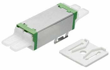 Adapter E-2000™-Compact flangeless with semi-transparent dust caps. Quick mounting clip integrated.