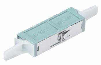 Adapter E-2000™ flangeless with semi-transparent dust caps. Quick mounting clip integrated.