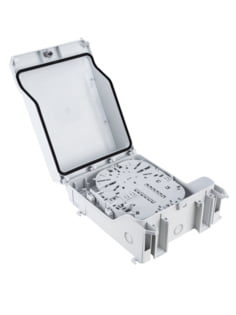 Polaris-box 16 with external mounting points equipped with a swiveling fiber inlay. On the top side adapter field for up to (12)/24 adapter (LC-D), SC or E-2000. On the back side splice area for up to 2 splice protectors 12 x crimp (ANT) or 12 x shrink (HS). Additional fiber storage are below the fiber inlay.