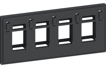 Screen for accommodating up to four 5-pole industrial connectors (e.g. Wieland Gesis® or Wago Winsta®). Suitable for installation in U-Boxes with 2 width units (WU) and 1.5 height units (HU).