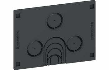 Screen for closing U-Boxes with 2 width units (WU) and 1.5 height units (HU) with predetermined breaking points for cable passages and cable glands.