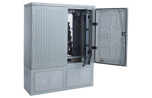 Street cabinet SCM 11 HD (application neutral) for subscriber cables of diameter 5-9/12-14 mm or blow-in tubes of 5/7/12/14 mm. Not included are cabinet base, cabinet accessories, strain relief kit, cable management, SpliceMODULE, SCM trays and accessories.