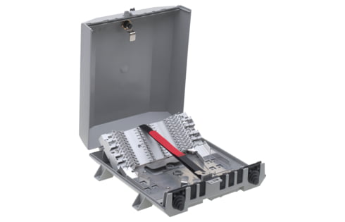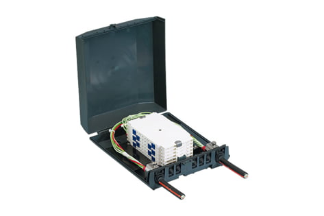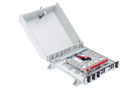 Venus Box with external fastening points, equipped with holder module for SCM splice or splitter trays. Allows cable-to-cable splicing and is ideal for fine distribution.
