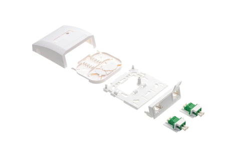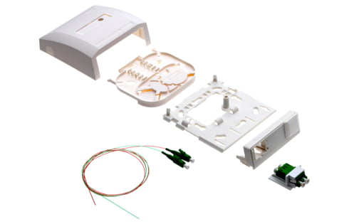 Repared for breakout or splicing with SC-RJadapter. Splice tray with splice holder and strain relief for 600 µm fibers. Combined through universal adapter with LC-Duplex, SC,BNC, Chinch and F-Coax. Connection modul RJ45/u with mounting plate.
