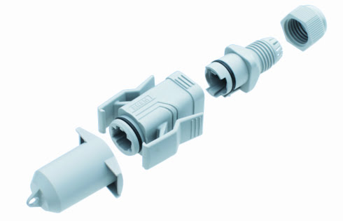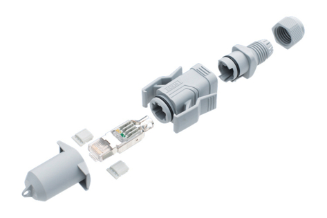 Protective housing for field terminateable RJ45connector with snap-in-latching. Protection class IP67 according to IEC 60529 and protective housing according to IEC 61076-3-106 variant 06 for cable diameters of 5.0mm to 8.5mm.