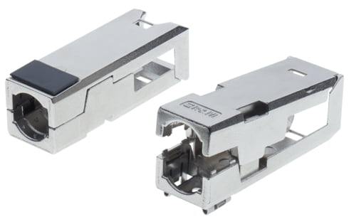 Metal protective housing for field terminateable RJ45 connector with snap-in-latching. Protection class IP20 according to IEC 60529 for cable diameters of 4.5mm to 10.0mm.