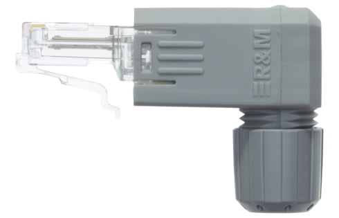 Field-terminated RJ45 plug connector, unshielded, Cat.5e 8-pole, terminated in IDC technology, suitable for solid or stranded wires, 2- to 8-wire conductors of diameter AWG 23 to AWG 26 (AWG 23/7 - 26/7), angled housing IP20, for cable diameters of 4.5mm to 8.0mm, coding in acc. with TIA 568A/B.