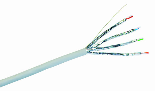 Cat. 7, F/FTP cable. Foil shielding of pairs. 100 Ohm impedance. Data transmission frequencies of up to 650 MHz.