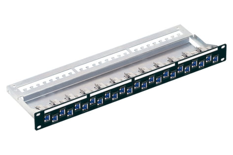 Patch panel with integrated cable tie shelf, optional direct grounding, 19" fastening kit, labeling field, accepting the snap-in type color coding clips in 8 colors.