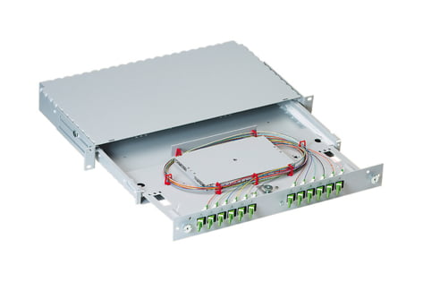 19" 1U slide-in unit, splice tray plate with splice tray radius 40 mm, fastening material, labeling strips and installation manual