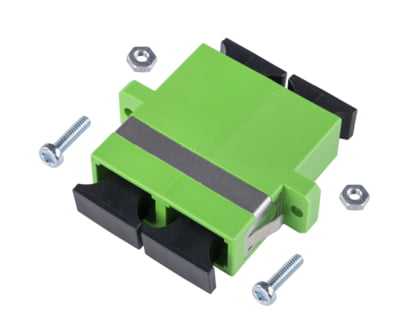 SC-Duplex adapter singlemode in acc. with IEC 61754-4. Body plus flange and two hexagonal nuts M2 plus integral quick-mounting clip. Zirconia (ceramic) alignment sleeve, green plastic housing (singlemode) / UL 94 V-0, plastic dust cover. Adapter qualified in acc. with IEC 61753-1 for category U (uncontrolled environment).