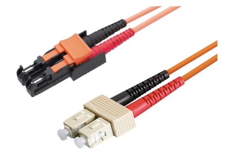 and one side with SC-Duplex connector in acc. with IEC 61754-4. Zirconia (ceramic) ferrule with a PC polished endface geometry, connector qualified in acc. with IEC 61753-1 for category C (controlled environment). Beige connector housing (multimode), material PBT / UL 94 V-0, beige duplex clip, 1 x black and 1 x red strain relief, material TPE / UL 94 V-0 and plastic dust cover.