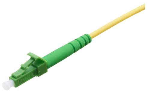 Mounted on both sides with LC connectors in acc. with IEC 61754-20. Zirconia (ceramic) ferrule with an angled polish APC 8° endface geometry, connectors tuned in accordance with IEC 61755-3-2 and qualified in acc. with IEC 61753-1 for category C (controlled environment). Green connector housing (singlemode), green simpleplex clip, material PC / UL 94 V-0, green strain relief, material TPE / UL 94 V-0 and white plastic dust cover.
