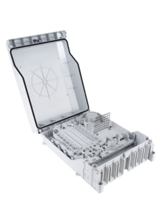 Polaris-box 36 with external mounting points equipped with a swiveling fiber inlay. On the top rigth side adapter field for up to 36 adapter LC-D, SC or E-2000. On the top left side splice area for up to 288 splice with 24 x 1TPU 12 x crimp (ANT) or 12 x shrink (HS) FMTS trays. Additional fiber storage arebelow the fiber inlay.