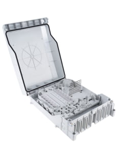 Polaris-box 36 with external mounting points equipped with a swiveling fiber inlay. On the top rigth side adapter field for up to 36 adapter LC-D, SC or E-2000. On the top left side splice area for up to 288 splice with 24 x 1TPU 12 x crimp (ANT) or 12 x shrink (HS) FMTS trays. Additional fiber storage arebelow the fiber inlay.