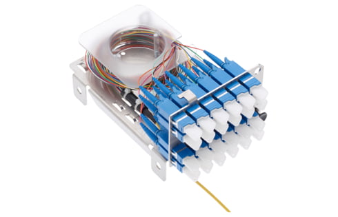 Complete patch insert, populated with adapters and system pigtails. For mounting into Venus Box FXL, providing storage room for loop installations or patch cords.